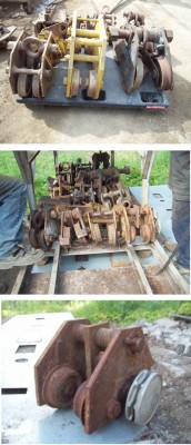 En inventaire, un très grand nombre de trolley. De très gros à petits. De plusieurs models ; des ordinaires, des commandés à chaine, des commandés électrique. Aussi, un très gros lot de pièces comprenant roues de 2" à 12" à guide simple ou double. Vous allez pouvoir faire plusieurs montages pour plusieurs utilité. Des chariots sur des guides plats ou en V. À note qu,il y a des palans à chaine jusqu'à 20 tonnes et il en a des neuf.