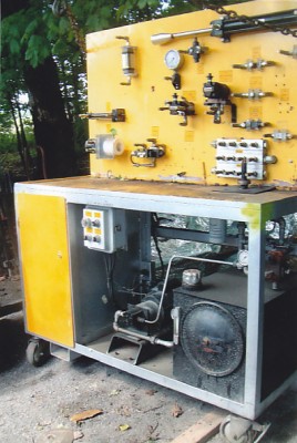 Dans la boite de bois, c'est un montage pour instructeur de métier pour aider a comprendre de quel manière circule les huiles hydrauliques dans un système où tout est transparent, même le cylindre. L'autre jaune est un ensemble de testeur de pompes de valves, de débit. Il faut qu'il soit accompagné d'une table de réserve d'huile et manutention . Tous les boyaux sont dans l'armoire.
