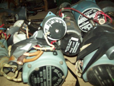 En inventaire, un nombre imposant de moteurs à vitesse variable. Ceux exposés ici sont des moteurs pas à pas. En inventaire plus de 180 réducteurs de vitesse variables, manuels. Jusqu'à 100 pour 1 et moins.