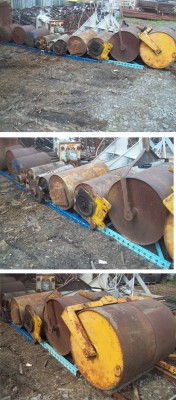 En inventaire, beaucoup de rouleaux à compactions. Ici, sont montrés des 14 à 16 pouces de diamètre lourds et légers. Quelques uns peuvent être remplient d'eau. de 30 pouces de long à 60 pouces de long. J'en ai aussi en stainless de 14 à 16 pouces. Aussi des rouleaux de convoyeurs non illustrés une tête de convoyeur 50 " X 36 " et le rouleau auto-nettoyeur. Aussi, en inventaire, j'ai des milliers de petits rouleaux de toutes sortes non illustrés.